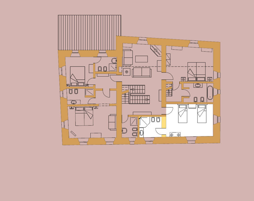 Un’altra camera su soppalco, con il proprio bagno, permette di raggiungere i 18 posti letto.